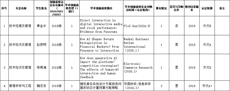 根据《成人小说 博士生申请学位学术创新成果认定办法》和我院相应专业的博士生培养方案要求及科研成果发表的相关规定,成人小说 对相关博士生的学术创新成果及科研情况进行了审核,现将结果予以公示。公示期15日,即自2026年4月14日至4月28日,在此期间若有异议,请及时反馈成人小说 。